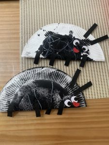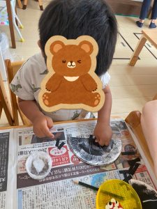 紙皿を土台に、2歳児さんはスポンジで色付け、1歳児さんはぬたくりを楽しみました!