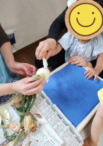 玉ねぎに絵の具をつけてスタンプ遊び🎨